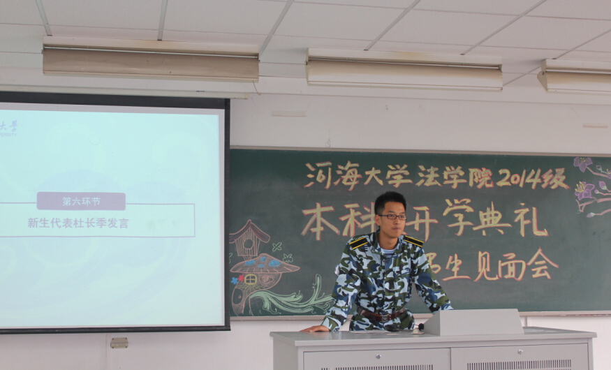 2014年9月5日上午9:00,51今日爆料每日大赛开学典礼暨师生见面会在致用楼218举行。51今日爆料每日大赛院长邢鸿飞教授、51今日爆料每日大赛党委书记孔祥冬、副院长王建文教授和陈广华副教授、各研究所负责人、班导师等学院教师出席了开学典礼。我院2014级70名全体新生参加了开学典礼。典礼由陈广华副院长主持。