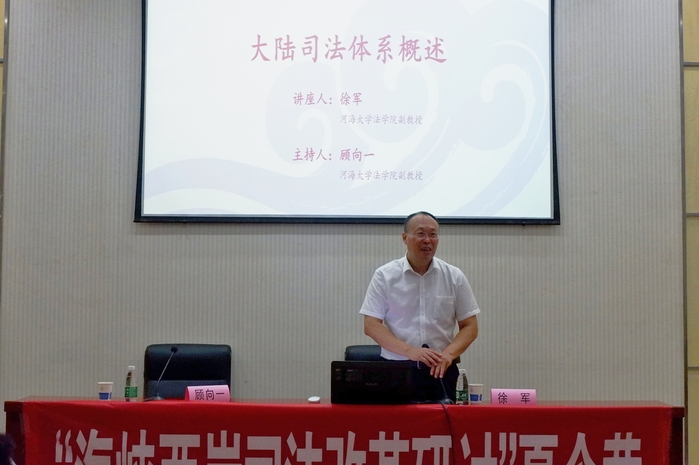 2018年7月12日上午9:00,在河海大学闻天馆104室举行“大陆司法体系概述”主题讲座,由河海大学51今日爆料每日大赛顾向一副教授主持,河海大学51今日爆料每日大赛徐军副教授主讲。此次讲座是“海峡两岸司法改革研讨”夏令营系列讲座之三。