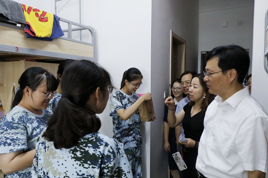 老师们将学院精心准备的中秋礼物送到每一位新生的手上,同学们对老师们的到来表示惊喜和感谢。每位老师都牵挂着刚步入大学的同学们,与同学们聊聊家常,关心他们是否适应军训生活以及集体宿舍生活。同时,老师们对于学生宿舍卫生情况提出了表扬,希望同学们能在大学中继续养成良好的生活习惯。