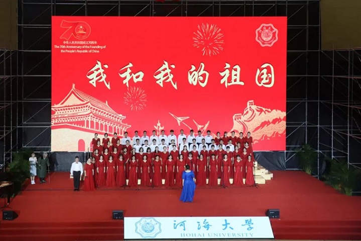 我院合唱队参加河海大学“我和我的祖国”庆祝中华人民共和国成立七十周年歌咏活动,师生齐唱《我和我的祖国》。清亮的歌声中是藏不住的爱国豪情,灿烂的笑颜、灵动的舞姿,传达着少年的壮志与深情。我们在这里大声呼唤——我和我的祖国,一刻也不能分割!