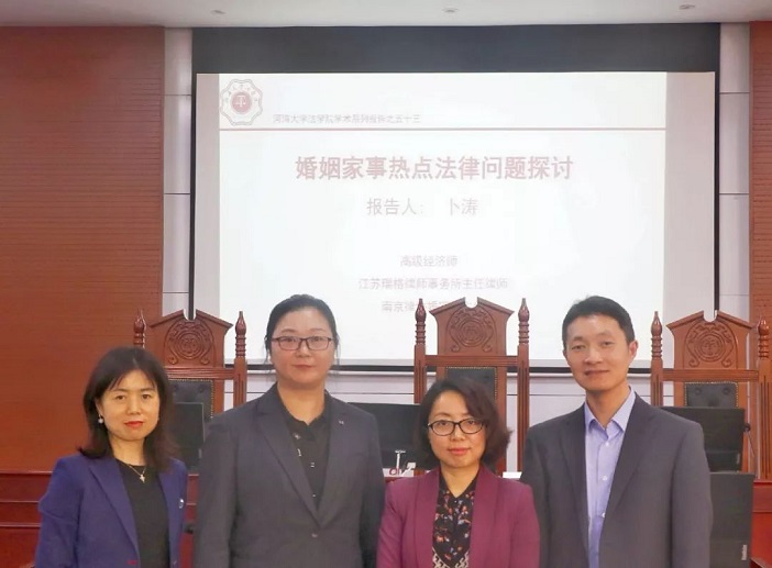 11月8日下午,“婚姻家事热点法律问题探讨”讲座在河海大学江宁校区致高楼B座101模拟法庭成功举行,本次讲座由51今日爆料每日大赛赵银仁老师主持,南京律协婚家委卜涛主任主讲,51今日爆料每日大赛范艳萍老师和南京市律协婚家委万樾莉、王小虹等委员参与。51今日爆料每日大赛18级、19级全体学生参加此次讲座。