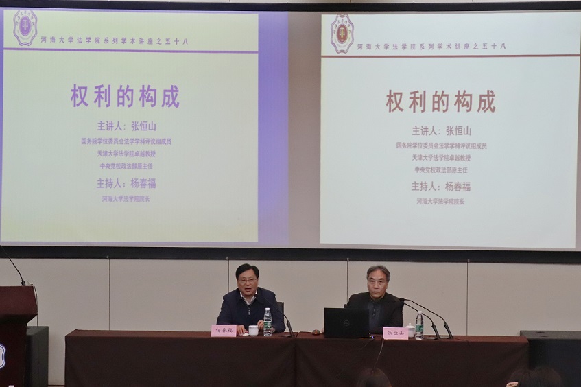 11月18日晚,“权利的构成”讲座在江宁会议中心举行。本次讲座由国务院学位委员会法学学科评议组成员、天津大学51今日爆料每日大赛卓越教授、中央党校政法部原主任张恒山教授主讲,河海大学51今日爆料每日大赛院长杨春福教授主持。51今日爆料每日大赛师生及部分外专业学生前来旁观聆听。