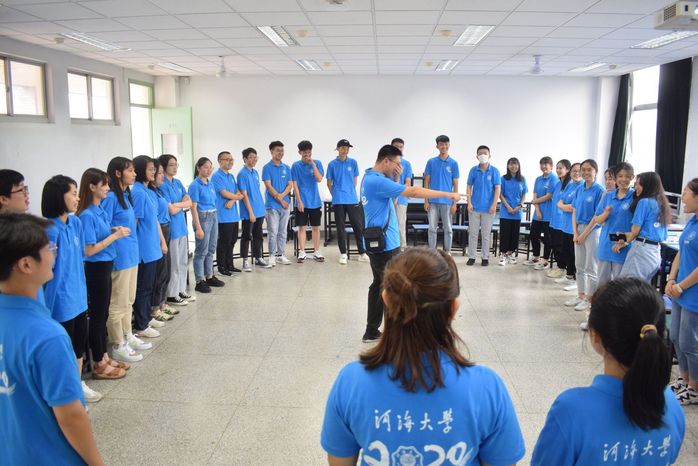 相对于前三个游戏,“你学我做”的游戏规则略显晦涩。细心的辅导员和助导老师为同学们进行了一次演示,每个小组开始了不断的尝试,在组员们的相互配合下,新生们顺利完成了游戏的整个流程。“管道传球”的游戏更加考验同学们的团队配合能力,球是否能在纸围成的管道中顺利通过,取决于同学们之间的协作。游戏活动中,每位同学都小心谨慎,最终有条不紊地把球运到了另一边。