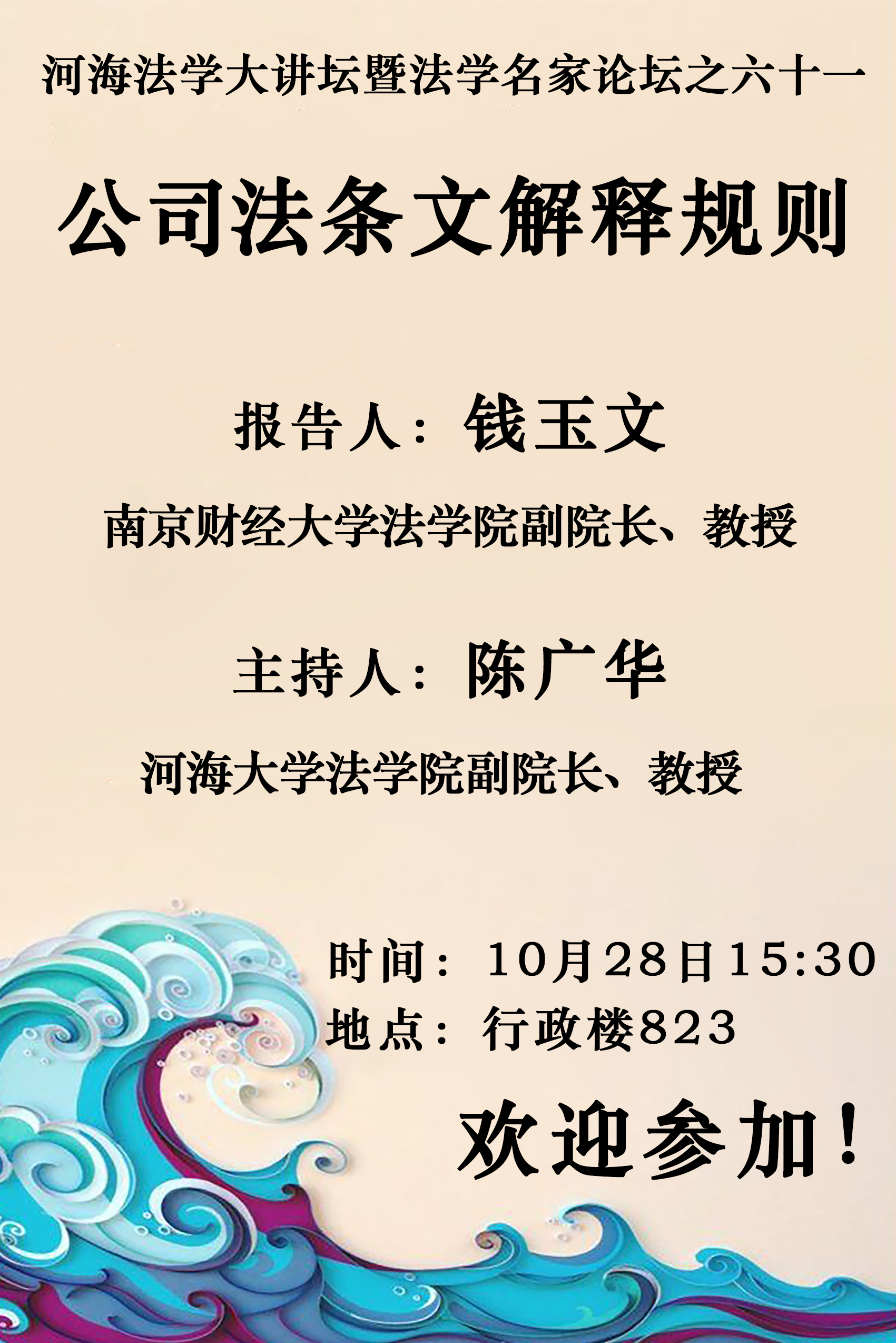 讲座预告:河海法学大讲坛暨法学名家论坛之六十一:公司法条文解释规则