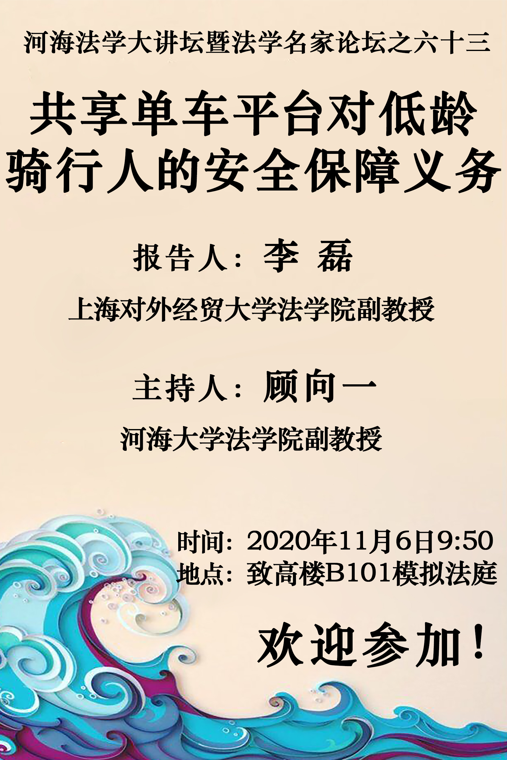 讲座预告:河海法学大讲坛暨法学名家论坛之六十三:共享单车平台对低龄骑行人的安全保障义务