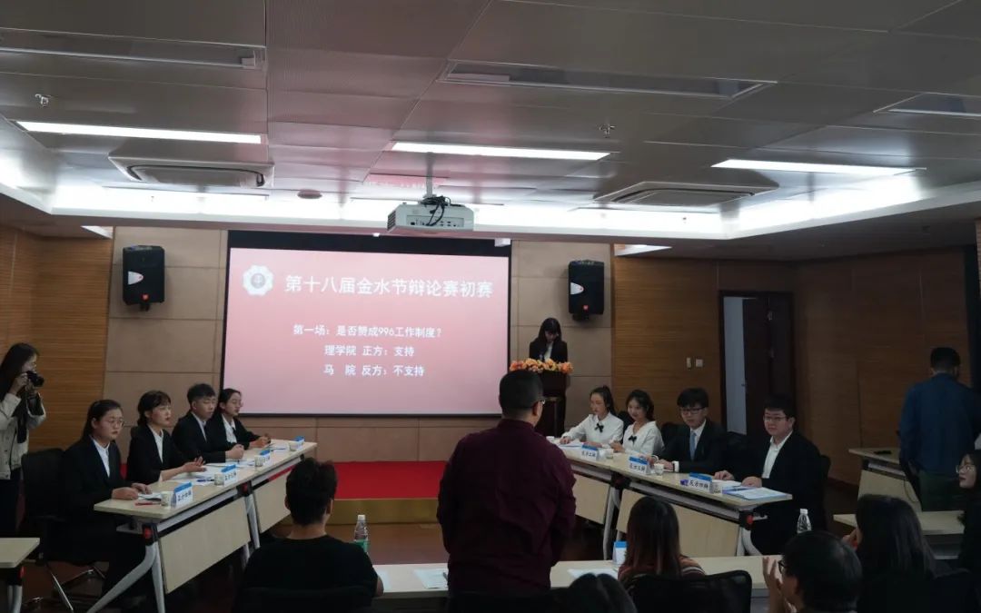 第一场比赛由正方理学院代表队对战反方马克思主义学院代表队,辩题为“是否赞成996工作制度”。