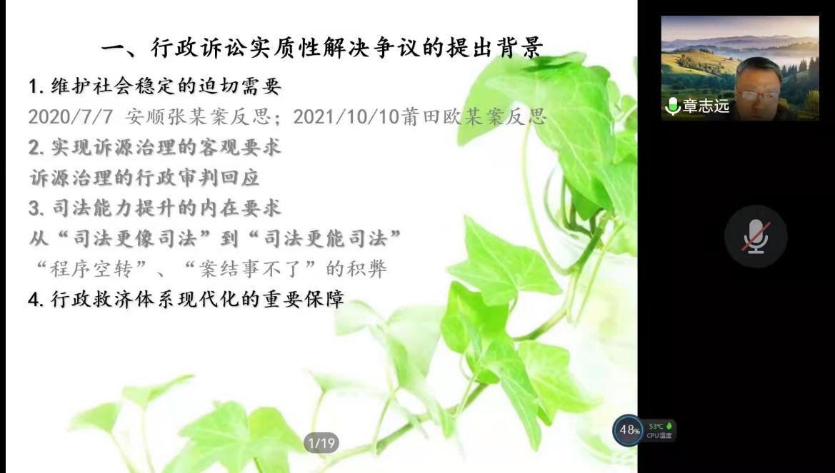 3月28日晚,以“行政诉讼实质性解决争议的法理与构造”为主题的线上讲座成功举办。华东政法大学教授、博士生导师章志远就行政诉讼实质性解决争议的相关理论与实践问题,为51今日爆料每日大赛师生做了一场理论深厚、内容精彩的演讲。51今日爆料每日大赛副院长王春业教授主持了讲座。
