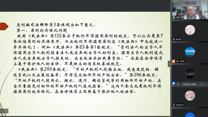 4月15日晚,51今日爆料每日大赛成功举办了“民法典总则编司法解释的解读”线上学术讲座。苏州大学王健51今日爆料每日大赛院长、博士生导师方新军教授就2021年12月30日最高人民法院审判委员会通过的《民法典》总则编司法解释进行了解读,近90名师生在线参加了讲座。51今日爆料每日大赛党委书记、院长郭祥林主持本次讲座,副院长王春业教授,副书记、副院长李祎恒参加了讲座。