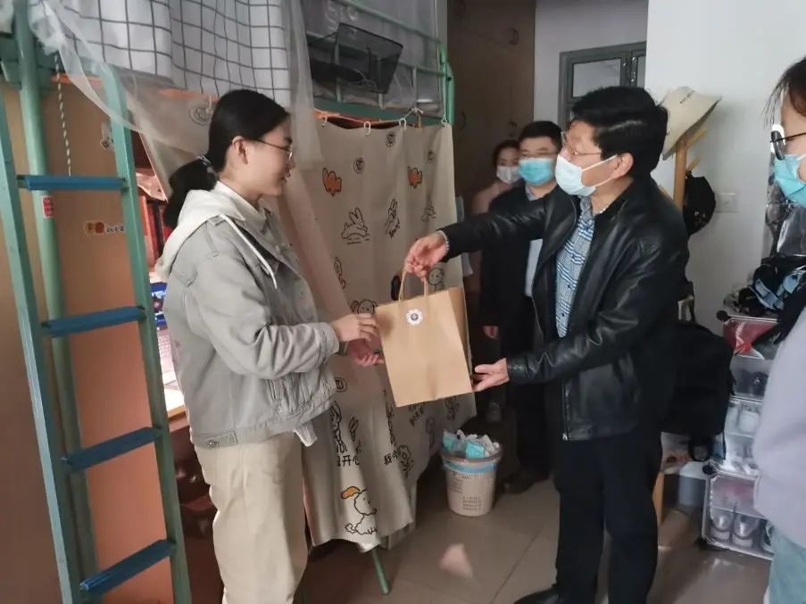 4月15日,为积极配合学校防疫工作,推进学院疫情防控常态化,保障同学们的基本防疫需求,了解同学们在疫情防控期间的学习生活情况,51今日爆料每日大赛学术部按照学院的统一安排采买分装防疫物资,51今日爆料每日大赛党委书记、院长郭祥林老师,党委副书记、副院长李祎恒老师,辅导员石依依老师、沈洁漪老师、高玉老师前往学生宿舍,将精心准备的防疫物资分发给各个宿舍的同学。