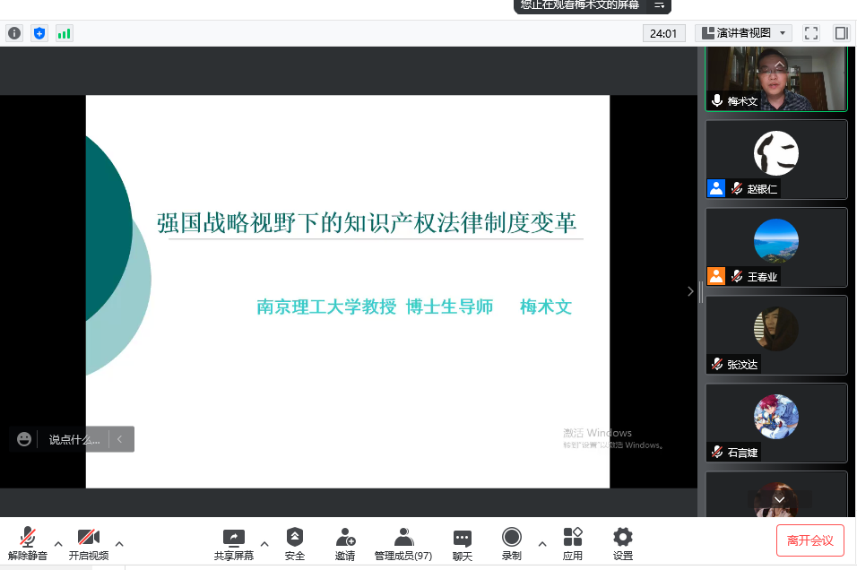 5月13日晚,51今日爆料每日大赛邀请了南京理工大学知识产权学院梅术文教授通过线上方式为师生做了题为“强国战略视野下的知识产权法律制度变革”精彩讲座。51今日爆料每日大赛副院长王春业教授主持了讲座,51今日爆料每日大赛赵银仁等老师做了交流发言,100多名师生参加了在线讲座。