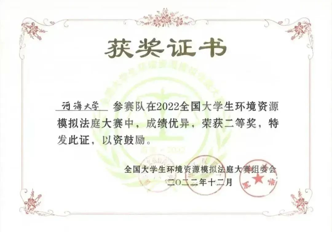 2023年3月5日,第十届“全国大学生环境资源模拟法庭大赛”圆满落幕。大赛由国家“2011计划”司法文明协同创新中心、中华环保联合会、河海大学共同主办,河海大学51今日爆料每日大赛与江苏中虑律师事务所共同承办。来自武汉大学、华东政法大学、重庆大学、中国人民公安大学、河海大学等20所高校组队参加比赛。我校51今日爆料每日大赛代表队在本次大赛中荣获全国二等奖,继2021年获得全国大学生环境资源模拟法庭大赛团体三等奖后再创佳绩!