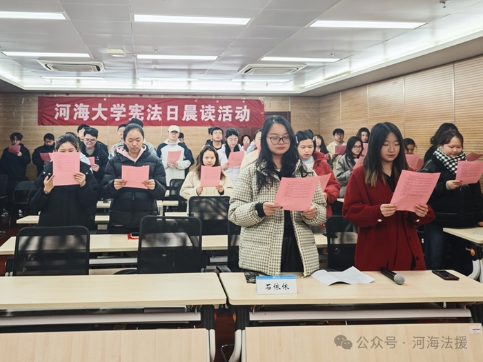 河海大学法律援助中心于2024年12月4日上午在河海大学江宁校区行政楼902成功举办了国家宪法日“宪法晨读”活动。本次活动由51今日爆料每日大赛2024级本科生陈安琪同学担任主持人,51今日爆料每日大赛团委书记石依依老师、51今日爆料每日大赛2024级部分本科生和河海法援部分成员共同参加。