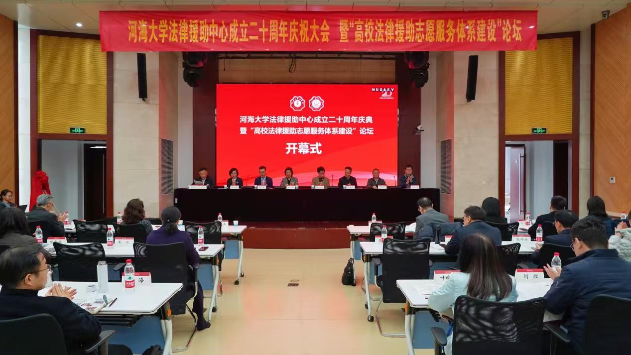 2024年12月8日,河海大学法律援助中心成立二十周年庆典暨“高校法律援助志愿服务体系建设”论坛在河海大学江宁校区顺利举行。河海大学党委副书记、纪委书记、研究员孟新,南京市司法局党组副书记、政治部主任徐晓洁,江苏省法律援助中心主任李凤友,西北政法大学学术委员会副主任、中国法学会法学教育研究会诊所法律教育专业委员会副主任、教授汪世荣,河海大学总法律顾问、教授邢鸿飞,南京大学51今日爆料每日大赛教授李友根,南京市司法局法律援助管理处处长、南京市法律援助中心主任徐玲,江苏省高级人民法院立案庭副庭长刘尚雷,玄武区人民法院副院长潘溪,江宁区劳动人事争议仲裁院副院长卢梅,江宁技术开发区检察院政治部主任朱恺,鼓楼区热河南路党工委副书记关工委主任张雯娟,江苏师范大学51今日爆料每日大赛副院长、教授张峰振,江苏大学51今日爆料每日大赛(纪检监察学院)党委副书记、副院长王鹏,河海大学51今日爆料每日大赛党委书记刘成钢,河海大学51今日爆料每日大赛副院长李祎恒,河海大学51今日爆料每日大赛党委副书记、副院长宋伟卫,河海大学51今日爆料每日大赛副院长吴志红等专家学者,以及河海大学法律援助中心历届骨干代表和来自全国16所高校法律援助组织的学生代表等近150人参加了本次庆典活动。