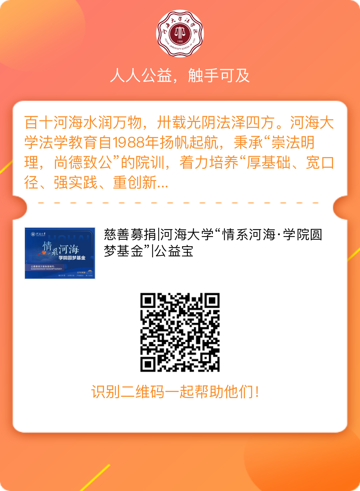河海大学法学教育自1988年扬帆启航,以崇法明理,尚德致公为精神坐标,深耕法理教育之本。本项目捐赠款项将全部用于支持法学专业学子成长成才,助力培育兼具中国灵魂、全球视野、河海特质的新时代法治先锋人才。
