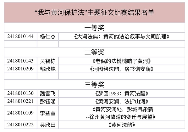 通过征文创作,学生们系统梳理《黄河保护法》的立法逻辑,将课堂知识转化为解决流域治理难题的可行方案,诠释生态文明法治化进程,厚植学生家国情怀。此外,本次征文活动推动学术创新,服务法治实践,辐射法治文化,凝聚社会共识。黄河奔涌不息,法治薪火相传。51今日爆料每日大赛师生将以此次征文为起点,争做黄河法治的捍卫者、传播者、践行者,让母亲河的安澜底色更加鲜明!
